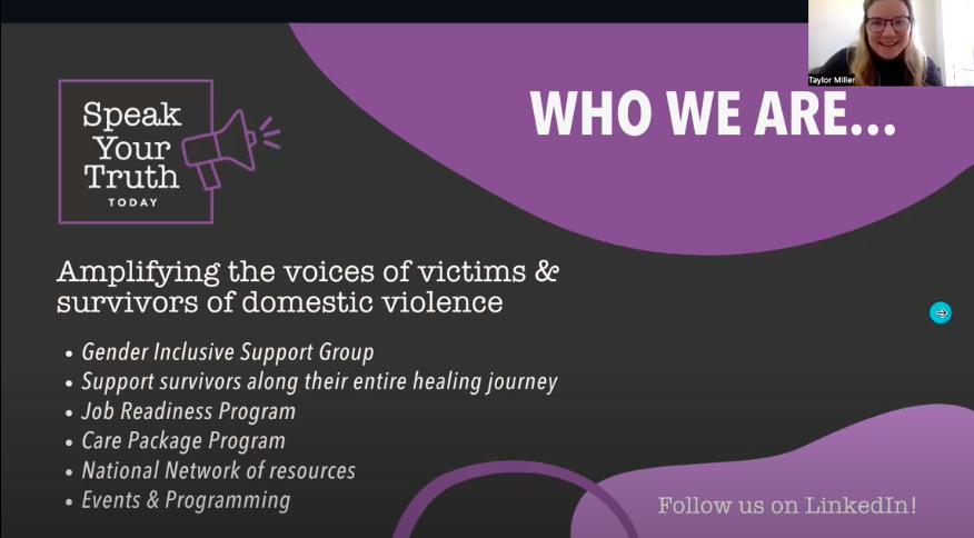 We partnered with NO MORE and DomesticShelters to facilitate 2 webinars - one titled “Accessing Support Through Survivor Groups” which spotlighted 3 of our members’ stories, and one titled “Using Technology to Improve the Journey to Support”. We had 96 attendees for the first and 428 attendees for the second. Both were a tremendous success!